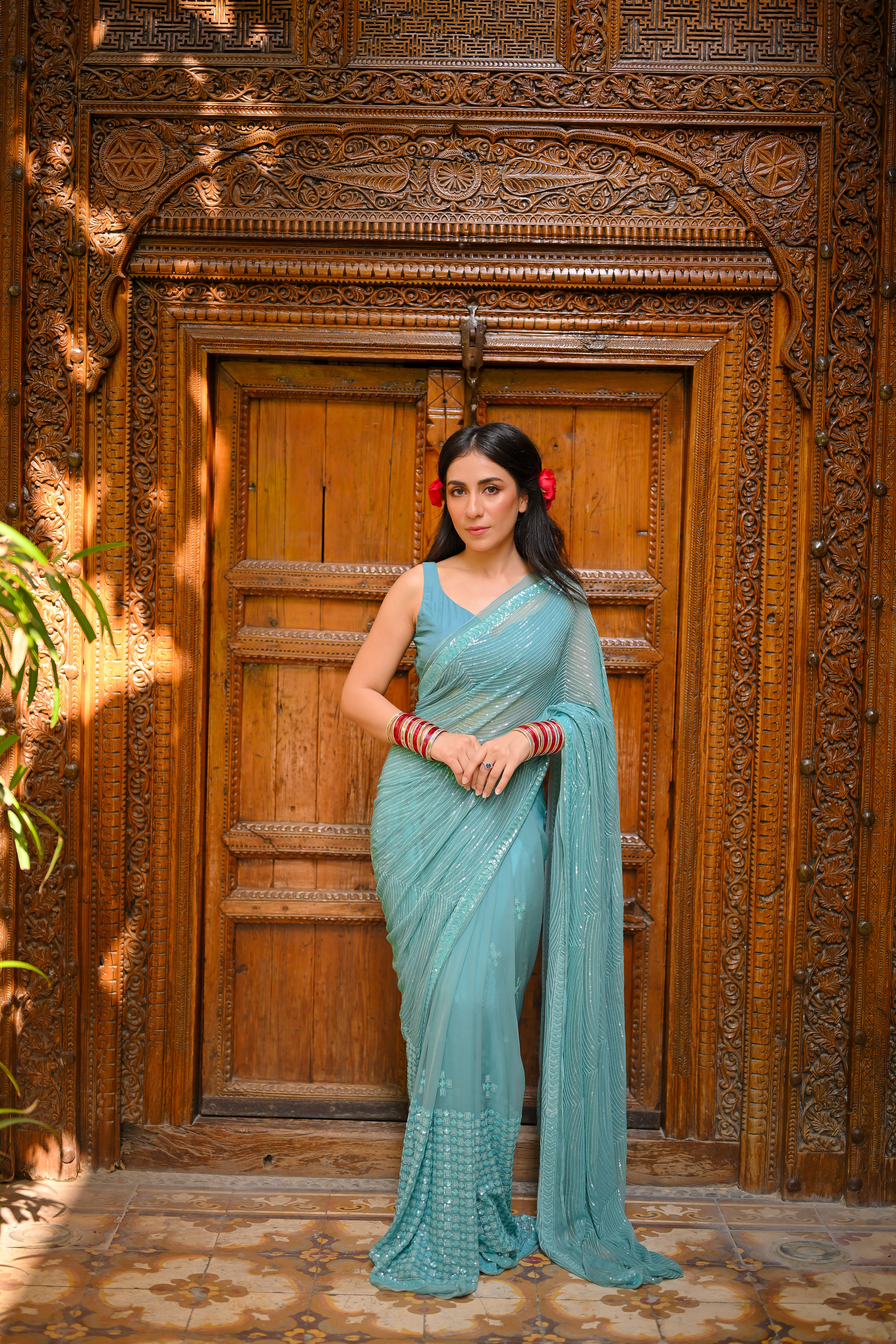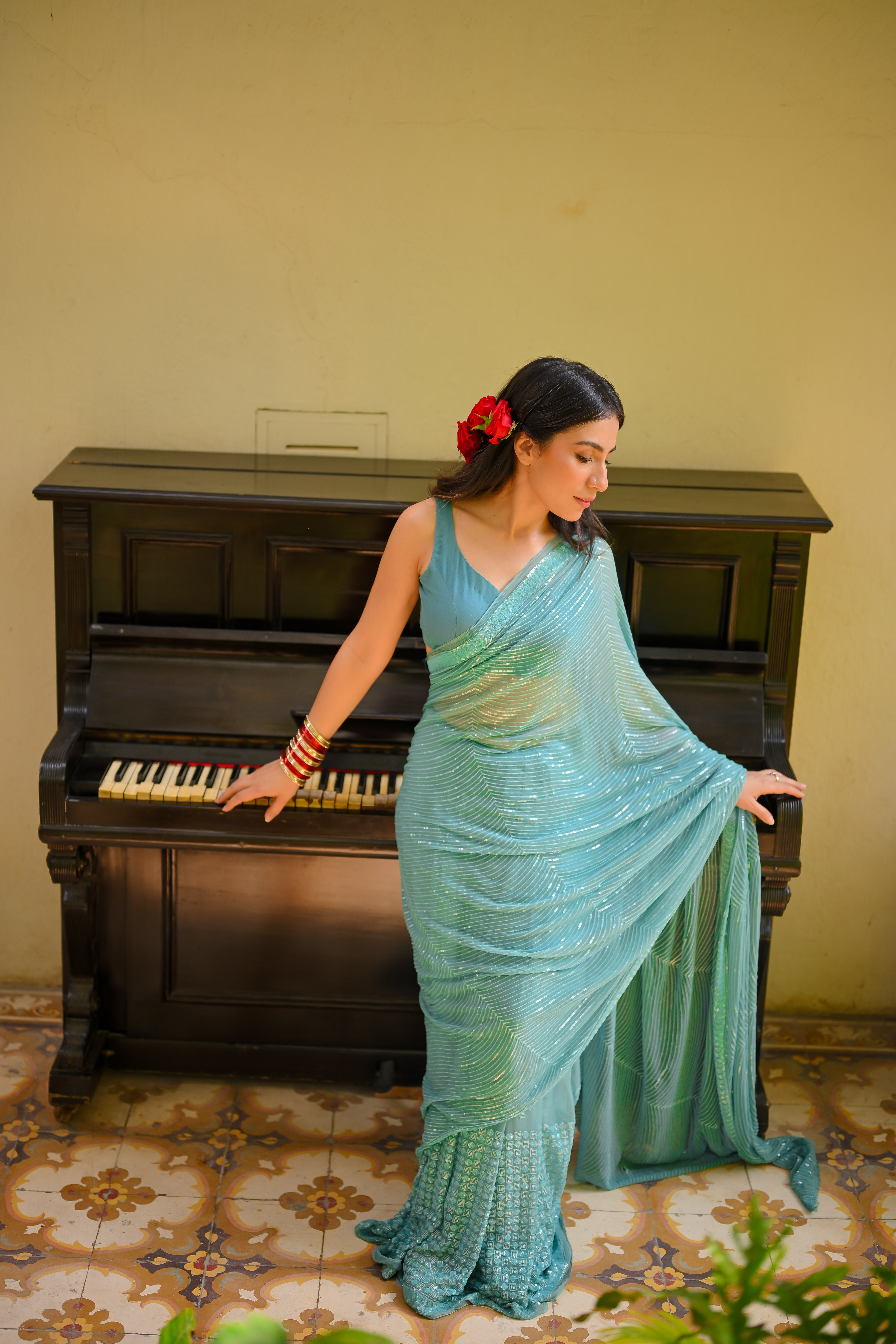- Stitched pre pleated saree , stitched blouse and a stitched petticoat.